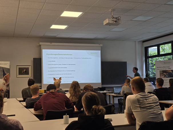 Der Betriebsleiter der Versuchsstation, Kai Gevers, gab einen Überblick über aktuelle Aufgaben und Projekte in Wehnen. Die Versuchsstation für Schweinehaltung existiert bereits seit 1979 und war bis 2015 für die überbetriebliche Ausbildung in der Schweinehaltung zuständig. Seit 2016 hat die Versuchsstation für Schweinehaltung an vielen Drittmittel-Projekten teilgenommen. Die Erkenntnisse aus interdisziplinären Projekten wie InnoPig haben zu neuen Ansätzen in der Buchtenstrukturierung in der Sauenhaltung geführt. Aktuelle Themen der Versuchsstation sind neben der Digitalisierung der Schweinehaltung (z.B. zur Geburtsüberwachung der Sauen) die Emissionsminderung im Stall oder die Vermeidung von Schwanzbeißen.