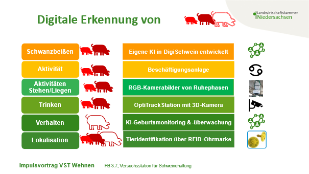 Digitalisierung wird in Zukunft noch mehr an Bedeutung gewinnen – so auch in der Sauen- und Schweinehaltung. Ein zentrales Anliegen in der Versuchsstation Wehnen ist es, die Dokumentation und den Lebenslauf der Tiere durch digitale Hilfsmittel noch effizienter zu gestalten. Unzählige Daten werden erstmals in Echtzeit erfasst – von jedem einzelnen Tier zur Fütterung, zum Trinkverhalten, zur Gesundheit u.v.m. Auf der Gruppenebene (in den Buchten) wurde das Stallklima (Temperaturwerte, Feuchtigkeit, Licht, Ammoniak, Co2) 24/7 erhoben. Die Identifizierung jedes einzelnen Schweins/Sau über Ohrmarken und RFID sei gelungen, die Erfassung der Tiererkennung und des Verhaltens der Tiere (v.a. Schwanzbeißen in der FAZ und Mast) über Künstlicher Intelligenz konnte durch beide Projekte in Wehnen deutlich optimiert werden. Das Dashboard über das Stallklima stellt eine Fülle von Daten tag- und buchtengenau zur Verfügung. Jetzt kommt es darauf an dieses Füllhorn von Daten intensiver auszuwerten und belastbare Zusammenhänge zum Tierwohl und zur Tiergesundheit eindeutiger herauszuarbeiten. Im Bereich künstlicher Intelligenz konnten große Fortschritte erzielt werden: die Früherkennung von Schwanzbeißen in der FAZ/Mast und die Unterstützung des Geburtsmonitorings im Sauenstall konnten erfolgreich mittels Künstlicher Intelligenz verbessert werden.