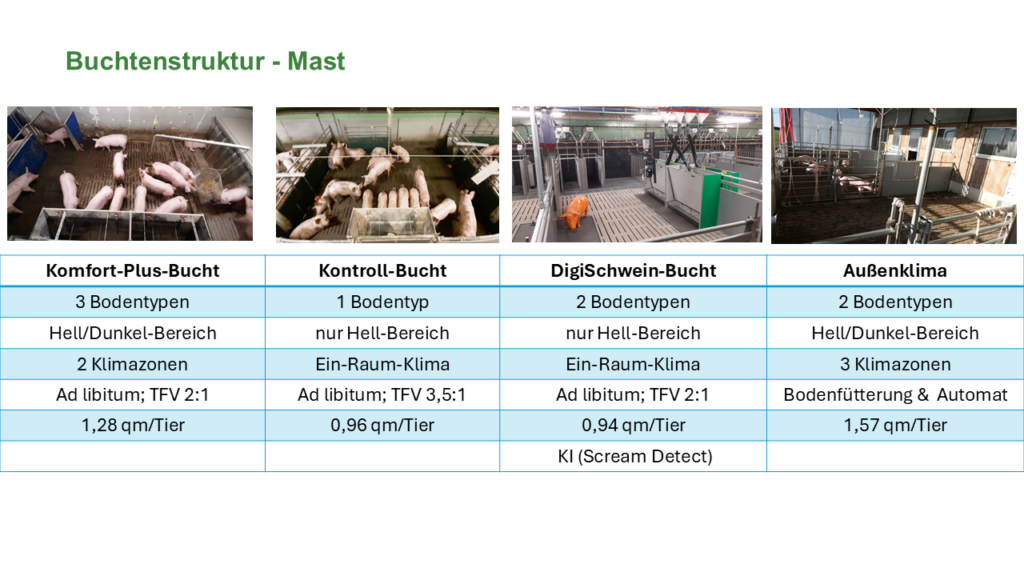 Die Buchtenstrukturierungen sind in den Projekten immer wieder angepasst worden. Im Projekt KoVeSch wurde in der Ferkelaufzucht und Mast die so genannte Komfort-Plus-Bucht eingerichtet, wo die Bucht als Drei-Flächen-Bucht aufgebaut wurde, die aus verschiedenen Funktionsbereichen bestand. Es gab einen Ruhebereich, der wärmer zu halten war, einen Aktivitäts- und Fressbereich sowie einen Kotbereich. Daneben wurden Vergleichsbuchten angelegt, in denen das Platzangebot (z.B. in der FAZ 0,35 qm statt 0,5 qm in der Komfort-Plus-Bucht), das Verhältnis von Tieren und Beschäftigungsmaterial, von Tieren und Trink- und Fressplätze variiert wurden.