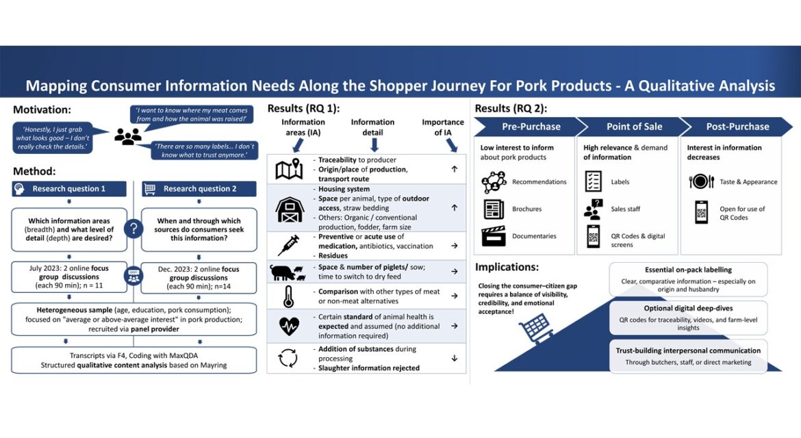 von Christian Achilles, Aurelia Schütz, Sarah Kühl Kürzlich wurde im Journal of Agriculture and Food Research ein wissenschaftlicher Beitrag veröffentlicht, der untersucht, welche Informationsinhalte und welche Detailtiefe Konsumentinnen und Konsumenten beim Kauf von Schweinefleisch bevorzugen. Darüber hinaus analysiert die Studie, wann und über welche Informationsquellen Konsumentinnen und Konsumenten entlang der
